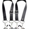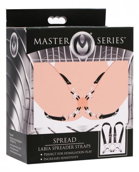 Turn up the intensity of your kinkiest scenes with these unique straps, designed to wrap around your thighs, clamp onto your labia, and spread them open! Perfect for humiliation play, gynecological role play, or whatever wicked fantasies you want to bring to life, this unique set keeps your partners genitals ultra sensitive and helplessly exposed like never before.<br /><br /> The straps are lined on the interior with a velvety softness and have buckles to adjust the fit around your thighs. The rubber tipped clamps have thumb screws that adjust their pressure. Get creative with your BDSM scenarios!<br /><br /> Measurements: adjusts from 16 inches to 28 inches between the tip of each clamp. Materials Polyurethane PU leather, metal. Color Black.